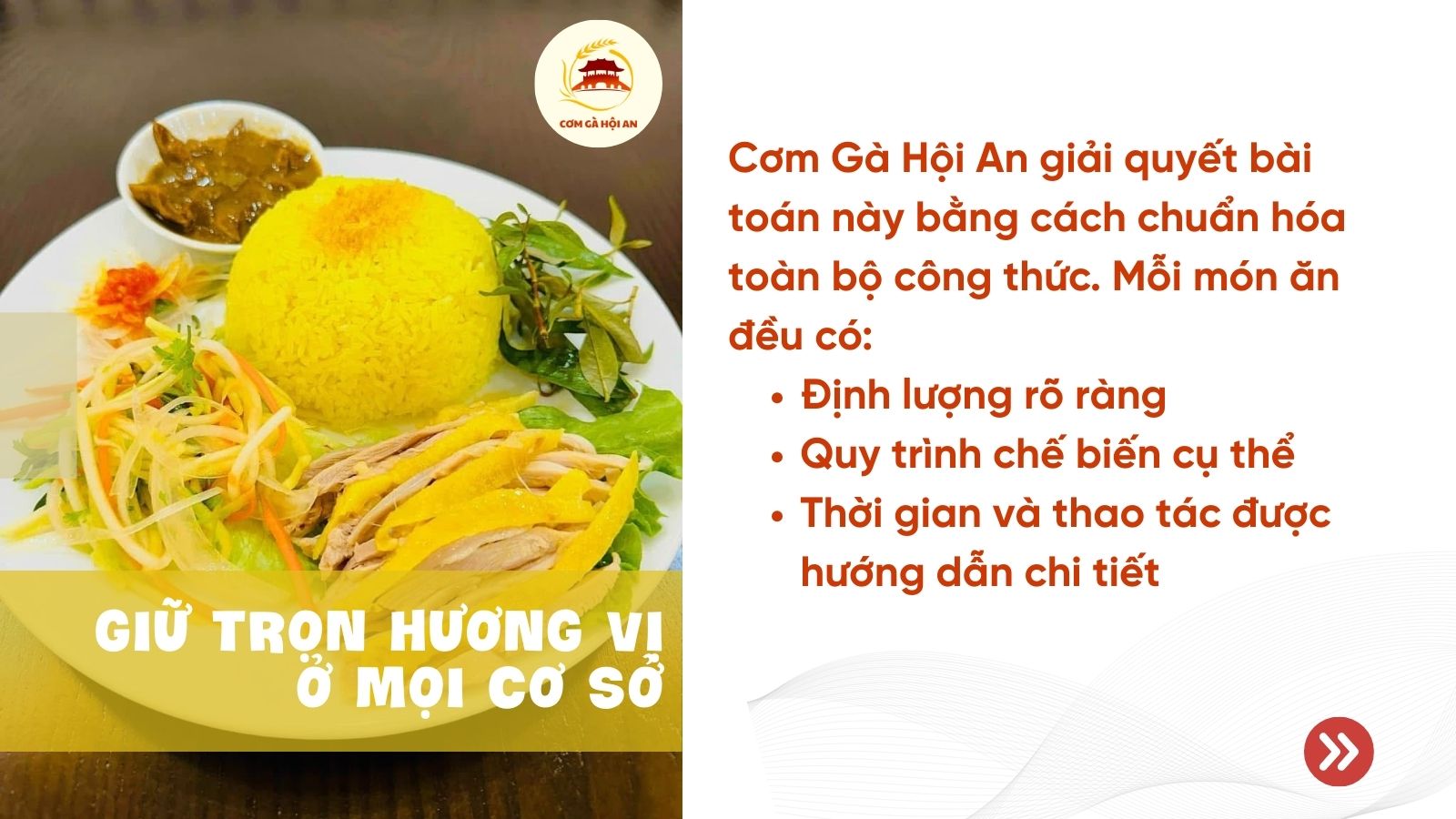 Một điểm khác biệt quan trọng của công thức Cơm Gà Hội An là không chỉ phục vụ vị giác, mà còn phục vụ vận hành. Công thức được thiết kế để: